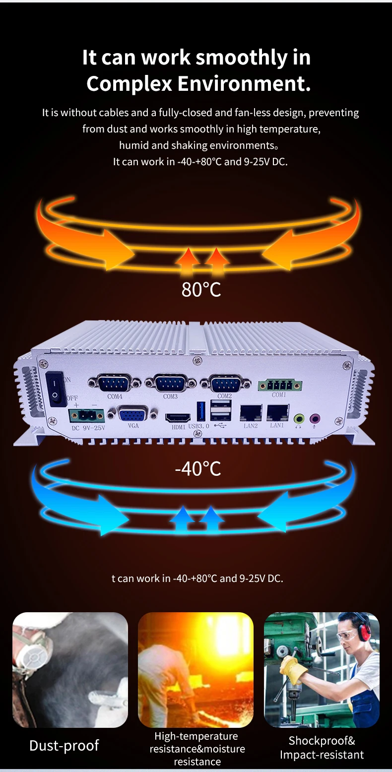 1.The Fanless industrial pc was made of brushed aluminum in beautiful shape,no cable design is good at shockproof, and high performance at low power consumption,can be used in hard environments. It supports wireless 3G and WIFI. 2.With the shockproof, moisture-proof, waterproof and dustproof (meet the NEMA IP65 standard), high temperature resistant, multisolt and easy to expand characteristics, so it iswidely used in industrial control,vehicle control, environmental control ,Miliary control,Network security,Digital signage,Date storge and other automation applications. Mini pc Features Order information About us (1) We are professional supplier of industrial computer and motherboard. (2) Our products have been well sold in many countries and regions,such as Europe,North America and Asia,etc. (3) We guarantee our products are in high quality and at reasonable price. Customer Service (1) Samples order are acceptable. (2) Customized products are acceptable. (3) Trial orders offered. (4) OEM,ODM are welcomed. Company detail: LingJiang was founded in 2002,which was specilize in making and exporting industrial computer, industrial motherboard, panel PC and so on . We done Research & Development , Assembing, Aging test, Maintain by ourselves. With the good enterprise culture, we have been award the high reputation in this line.We insist that " Customer First" as the management idea, and be in good faith and equality to others.We are committed to our mission and try our best to satisfy the customers.