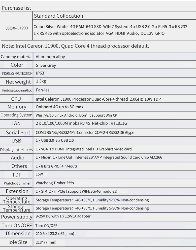 | Industrial Computer with intel celeron j1900 CPU 4Gb ram 64Gb Rom 2 LAN 1 RS485 Fanless Mini PC |