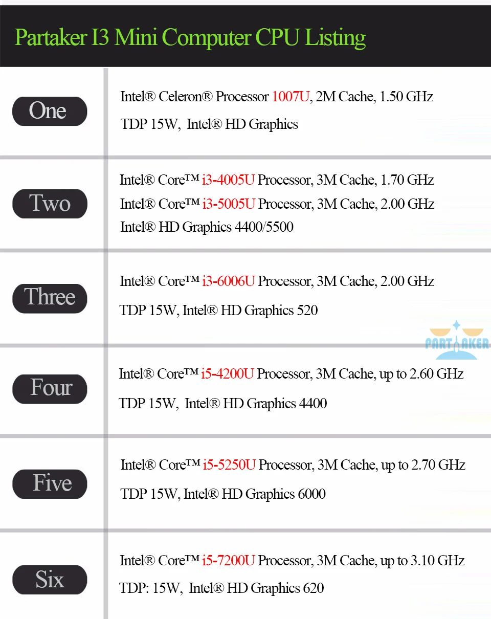 1. CPU Intel Core i5 5250U 2 core 4 threads 3MB cache 1.6GHz Max 2.7GHz TDP 15W Graphics HD 6000.