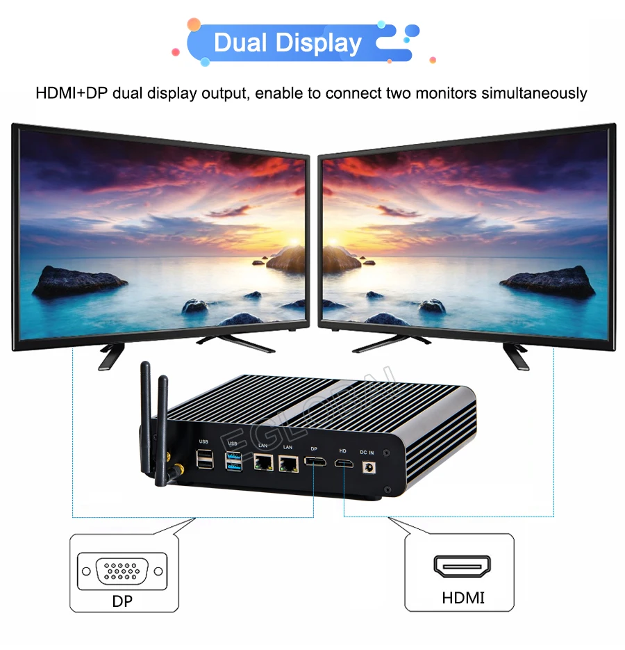 Eglobal Portable Mini Computer Intel Core i5 8250U i7 8550U Windows 10 Fan Mini PC M.2 SSD 2 RJ45 Lan DP HDMI 4K Display HTPC