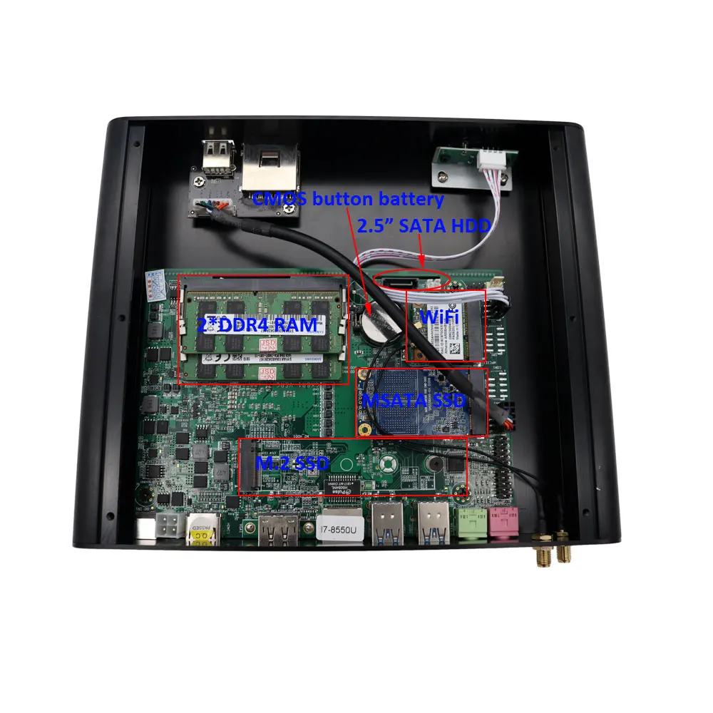 ♦ Full aluminum black color shell, Exquisite production craft on ouside design♦ Fanless system without cooling fan and slim design 210*170*45MM ♦ Low consumption TDP only 15W♦ Can stand up or can be mounted back of monitor or wall♦ Can install 1pc M.2 SSD, 1pc MSATA SSD and 1pc 2.5” SATA HDD together♦ Support DP + HDMI dual display output synchronously, 4K HD playerSpecification:Image of I7 7500U 8550 Intel Core PC:
