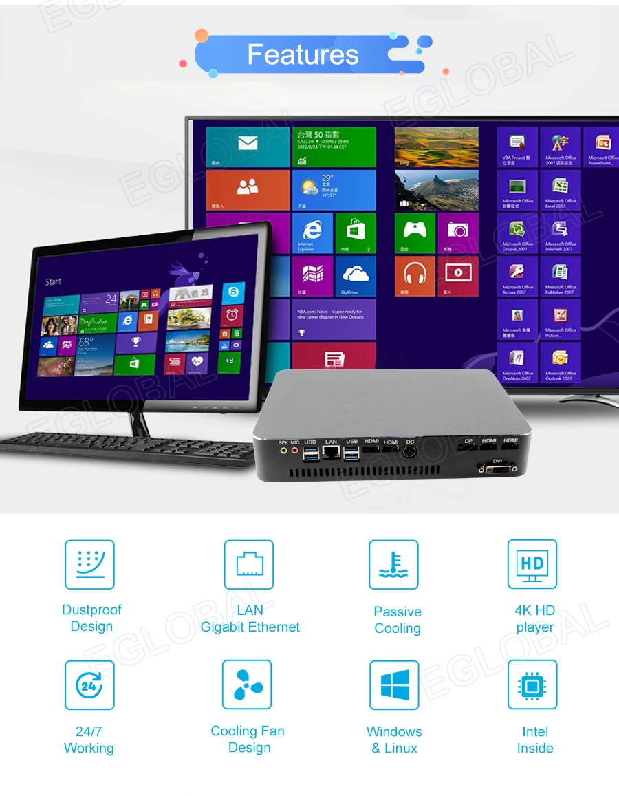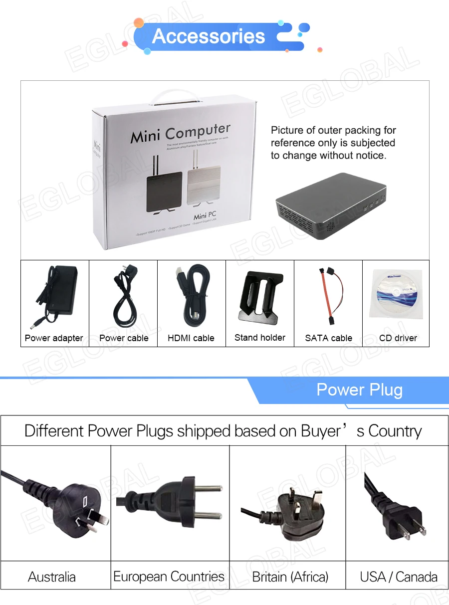Please read the following points carefully before order. 1. About shipping:We supply Free Shipping. Price here include shipping cost. But if your address is remote area for us , you should add extra shipping fees for DHL/ UPS/EMS/Fedex etc. Normally we will provide DHL free shipping, but we will also send by the other carriers for free shipping in different cases, they are UPS/EMS or e-EMS/FedEx/TNT/ARAMEX etc. In general, it may take about 1 to 3 business days for delivery; (except the holidays)quantity OEM producing orders may take about 7 to 15 days depends on the exact order. We are not responsible for wrong or undelivered address. Please make sure your shipping address is correct and deliverable. 2. About systems:We can provide free OEM cracked win7/ 8/ 10/ Linux/ Ubuntu, etc. Default installed our OEM Window 10 OS in English for free , other languages can be selected amount: Russian, Spanish, Portuguese, French, German, Arabic, Italian, Japanese, Turkish, Greek etc. Seller are not responsible and makes no compensation for OEM system. Please note the Operating System you need when ordering. 3. About accessories:Accessories as Ram, SSD, HDD, we use famous brand: Samsung, Kingston, Micron, Sandisk, Hynix, Crucial, Liteon, Phison, T0shiba, HGST, WD, Seagate etc. What brand we use depends on our test and our stock. (The bundles is not including the HDD, if u need HDD, please talk with us online) 4. About customs:Price not including any import tax or other customs fee. We are not responsible for buyer's customs any storage costs, brokerage, taxes or VAT etc fees. But we try our best to help buyer lower or avoid customs duties, usually write a value of USD $20-70 on package and describle item as "Mini PC". If you have any questions or need to declare real price, pls don't hesitate to contact with us in time, we will do everything we can to help you. 5We can making your logo on the product case by laser printing.( If you need pls provide us a high-definition picture by TIF format). 6. Please note the plug model you need when placing an order. Tips: Buy with confidence! 3 Years long warranty EGLOBAL Mini pcs have 3 years warranty service is completely reliable and professional technical team. Motherboard warranty time 3 years, ram, hard drive, accessories(excluding gift) etc warranty time 1 year. Within warranty time, if mini PC appear non-human damages and quality problems, buyer return Mini PC or Mini PC components, we free repair/exchange Mini PC or Mini PC components ( include RAMs, Hard Drive, Motherboard and other accessories ). Within 1 month, seller bear all the shipping cost for return(maximum 15USD)and resend;Over 1 month to 1 year, buyer self bear the shipping cost for return and seller bear shipping cost for resend; Over 1 year to 3 years, buyer bear all shipping cost return and resend. Within 15 days, we accept refund or exchange goods (buyer bear all the shipping cost, if non-human damages and quality problem, we bear all shipping cost. All time calculate from the day buyer receive goods.