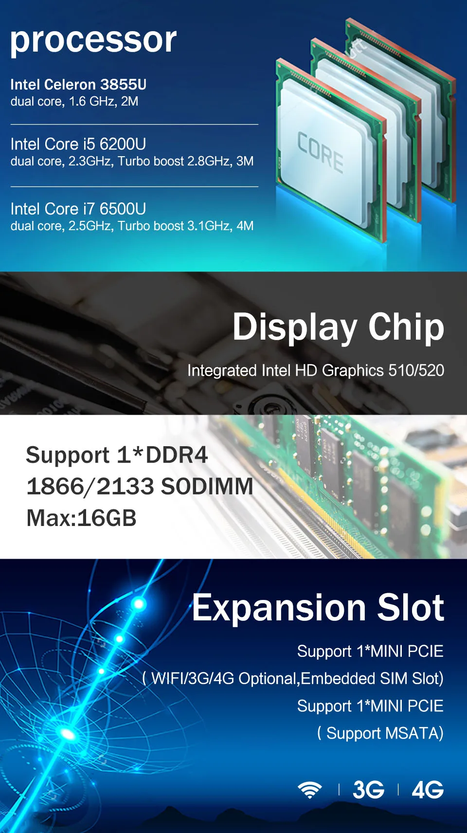 This Mini PC Motherboard can install 4 types of processors: