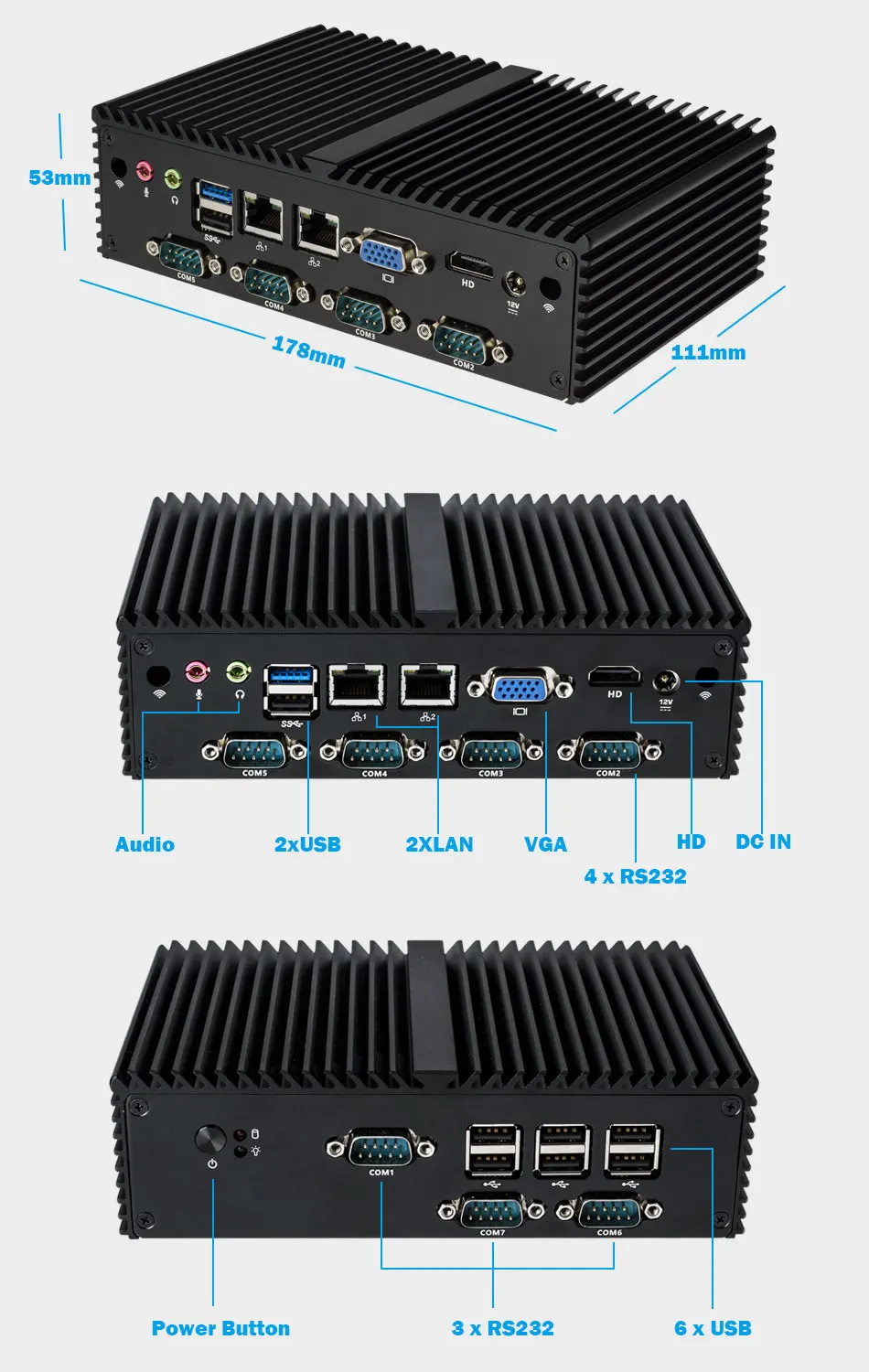 - Strong: Multiple interfaces; 2 Intel Gigabit LAN+7 RS232 COM+1 USB3.0+7 USB2.0+1 HD Video+1 VGA Suit for multiple application for example integrate with touch devices, industries, car repair shops, security, education, home as HTPC, business, fanancial and projects;