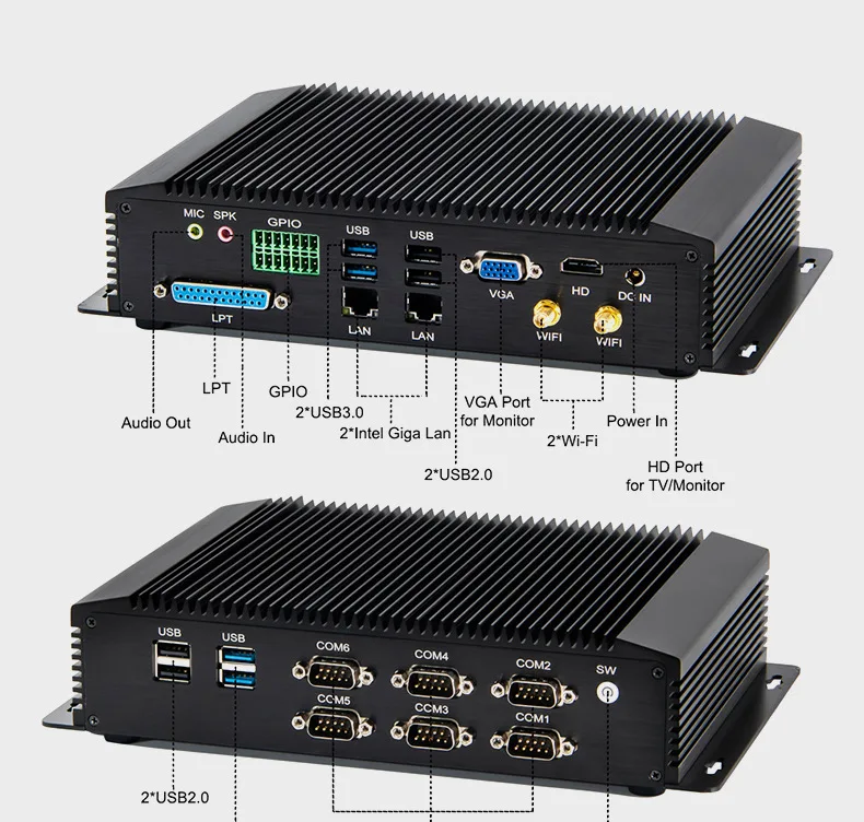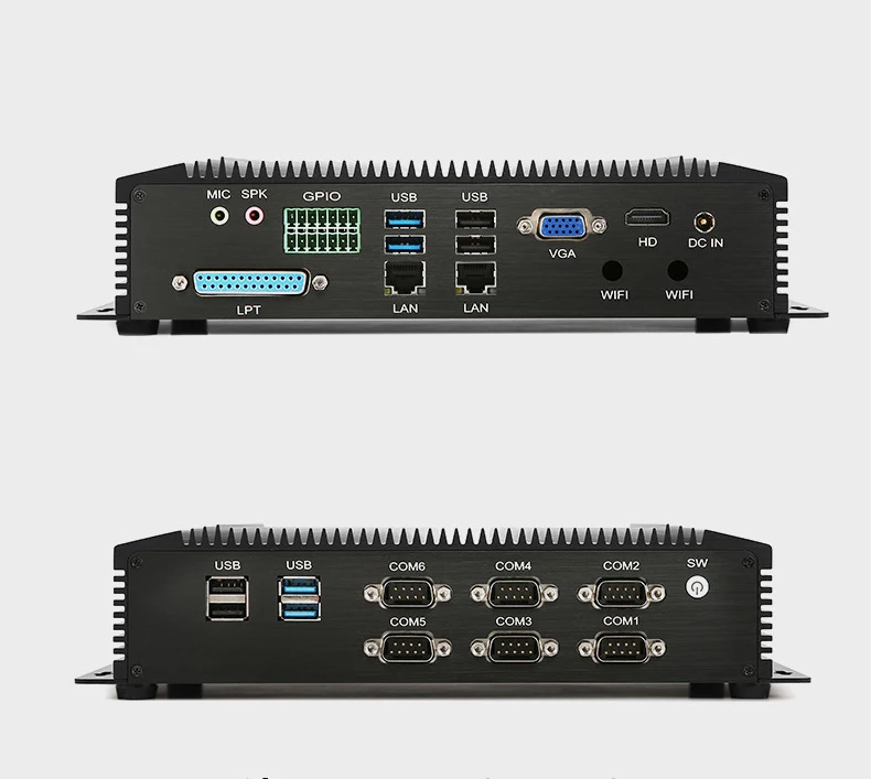 2. 6 COM port. COM 1&COM 2 Support RS232 RS422 RS485 switch from BIOS setting,no need to open the device.