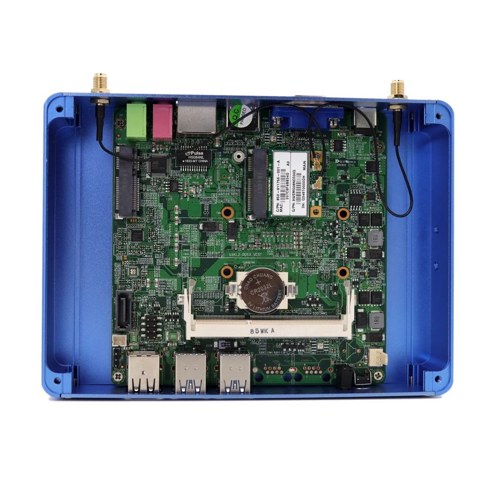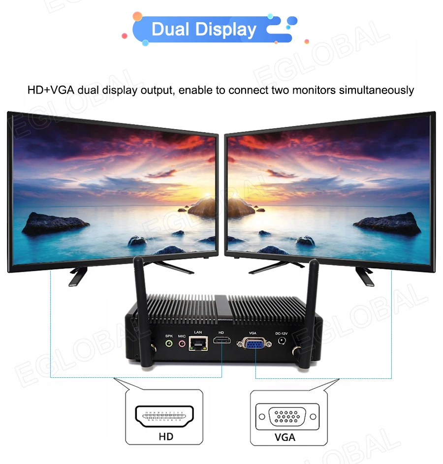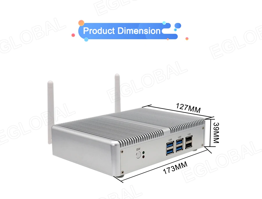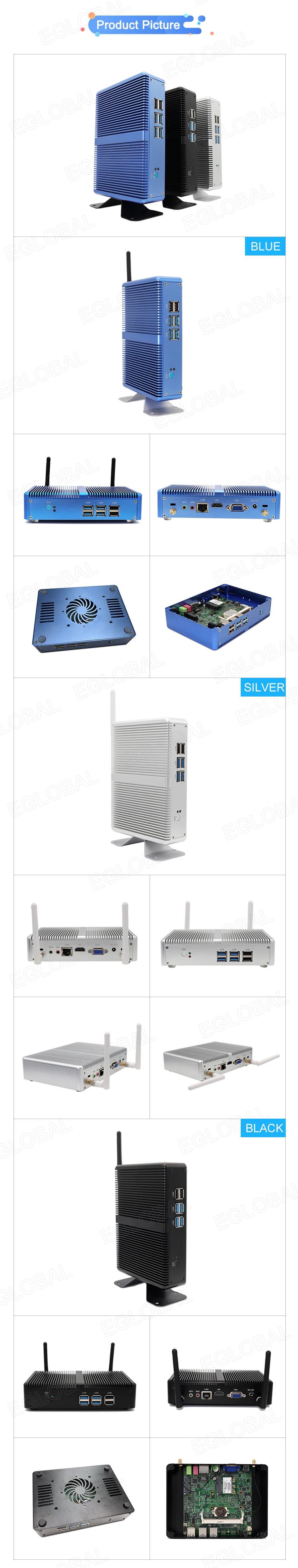 - Support HDMI and VGA dual display output synchronously.- Full Aluminum Alloy Silver/Black/Blue color shell, Exquisite production craft on outside design with high quality and stable performance, slim dimension 173*127*39MM.- Fanless system without cooling fan, no any noise, work as long as 24 hours.