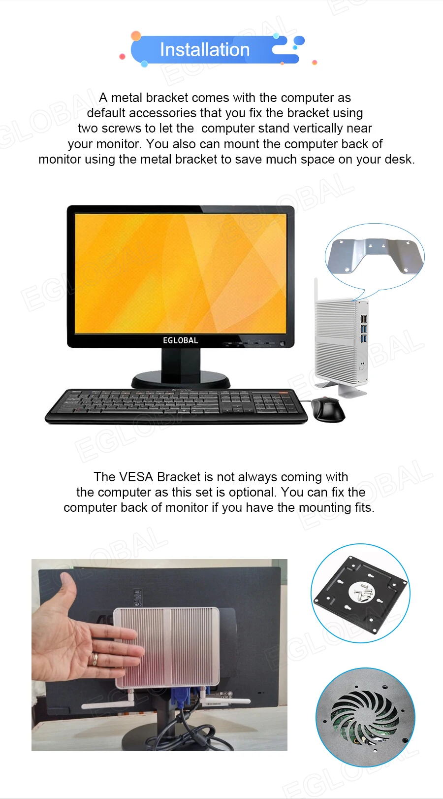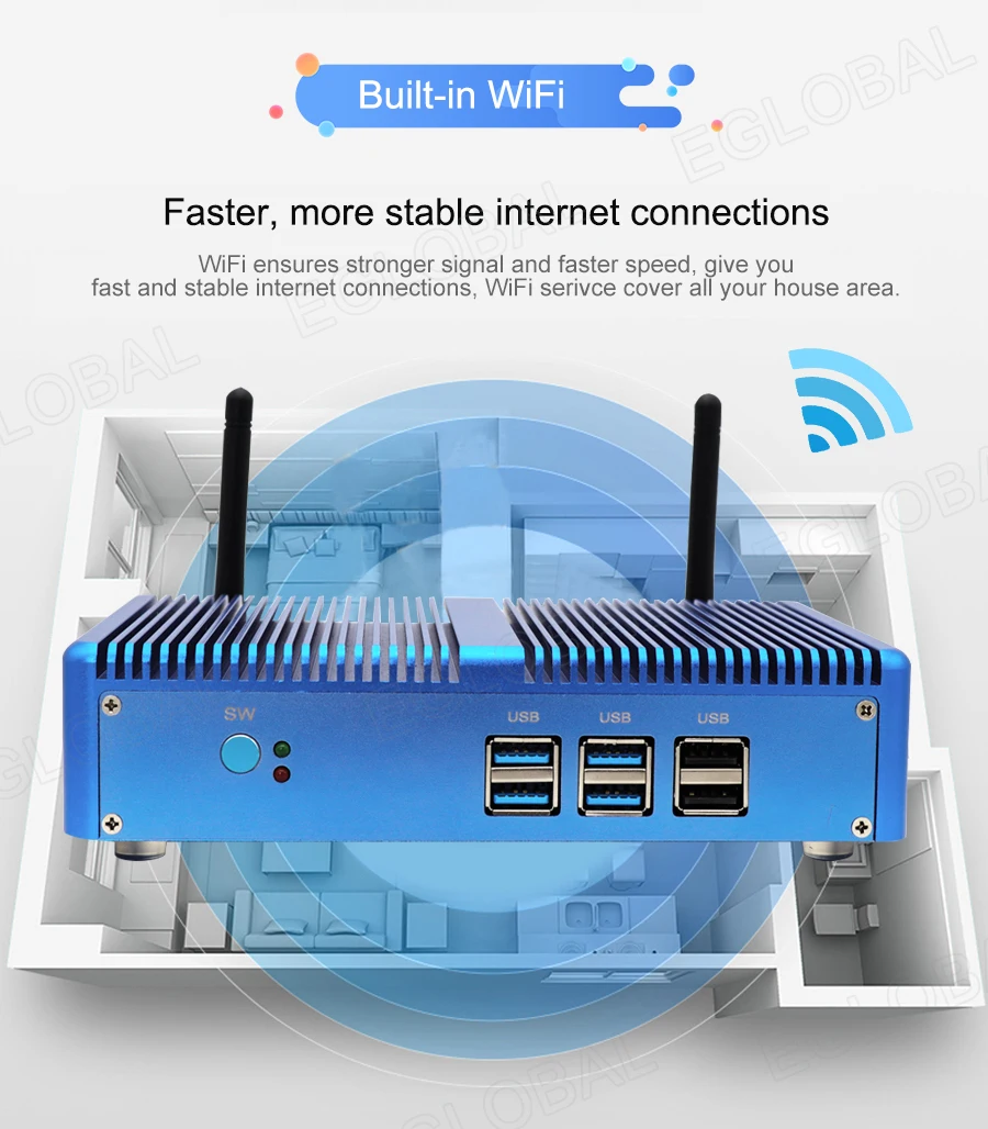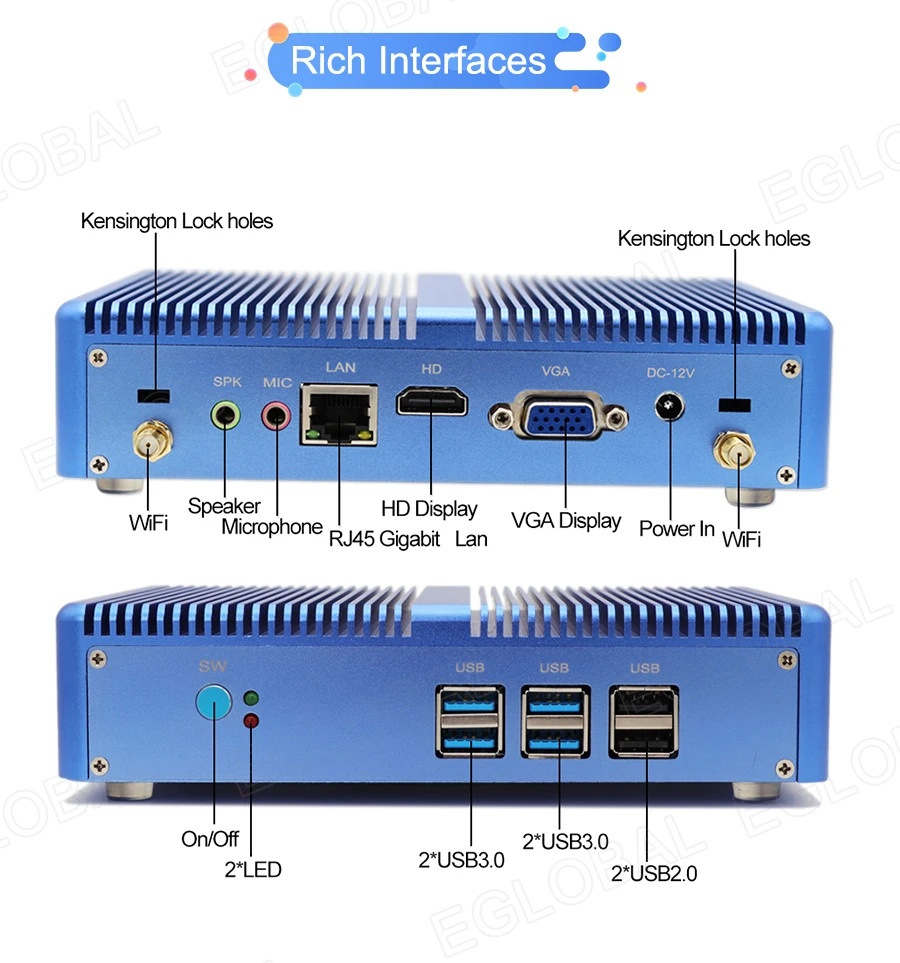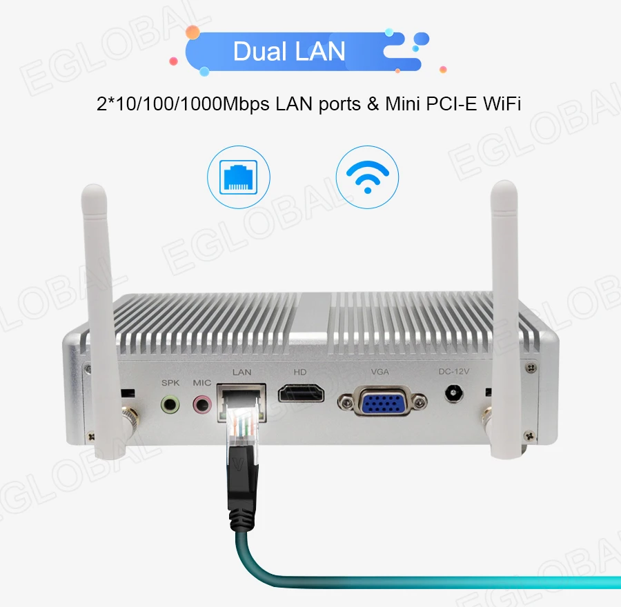 - Support HDMI and VGA dual display output synchronously.- Full Aluminum Alloy Silver/Black/Blue color shell, Exquisite production craft on outside design with high quality and stable performance, slim dimension 173*127*39MM.- Fanless system without cooling fan, no any noise, work as long as 24 hours.