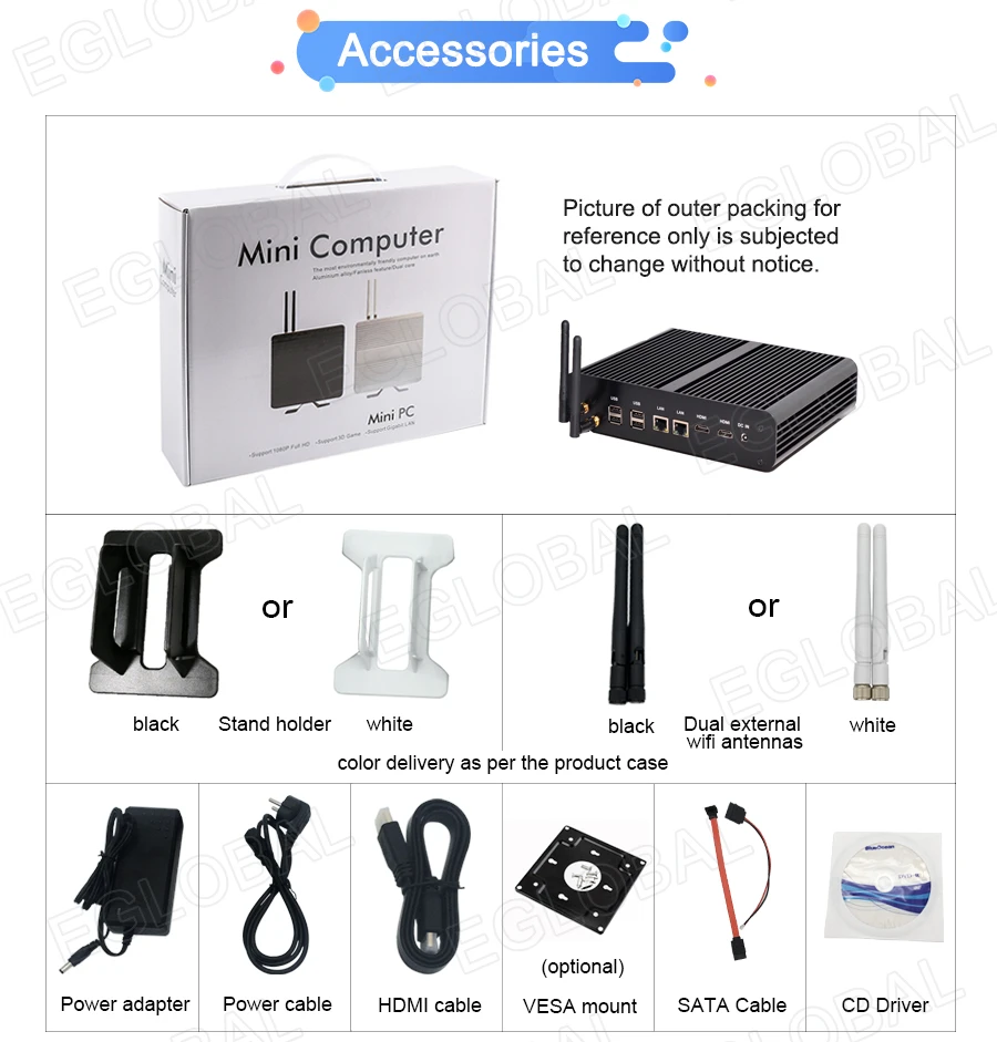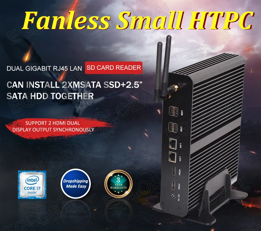 Eglobal Hot selling Windows mini pc intel core i7 5500U I7 4650U barebone system fanless mini computer HD Graphics 5000 wireless Product highlight: - Dual Gigabit RJ45 LAN, SD card reader, USB and Optical multiple ports. - Brushed Full Aluminum Alloy Black color shell, Exquisite production craft on outside design. - Fanless system without cooling fan, no any noise, work as long as 24 hours. - Low consumption TDP only 15W, save much energy and eco-friendly. - Can stand up by free plastic stand holder or can be fixed back of monitor by VESA mount. - Can install 2xMSATA SSD+2.5” SATA HDD together. - Support 2 HDMI dual display output synchronously. CPU: Onboard Intel Core i7 4500U 1.8GHz Max 3.0GHz(Turbo boost Technology) Dual Core Four Threads CPU: Onboard Intel Core i7 4650U 1.7GHz Max 3.3GHz(Turbo boost Technology) Dual Core Four Threads CPU: Onboard Intel Core i7 5500U 2.4GHz Max 3.0MHz(Turbo boost Technology) Dual Core Four Threads