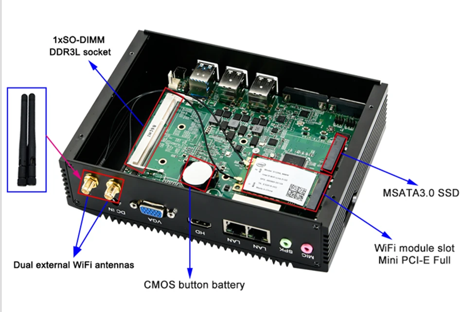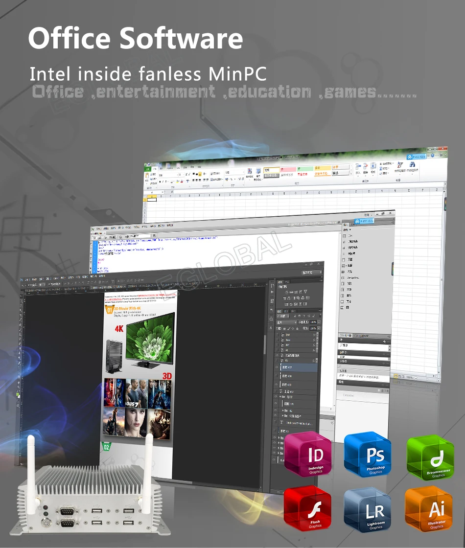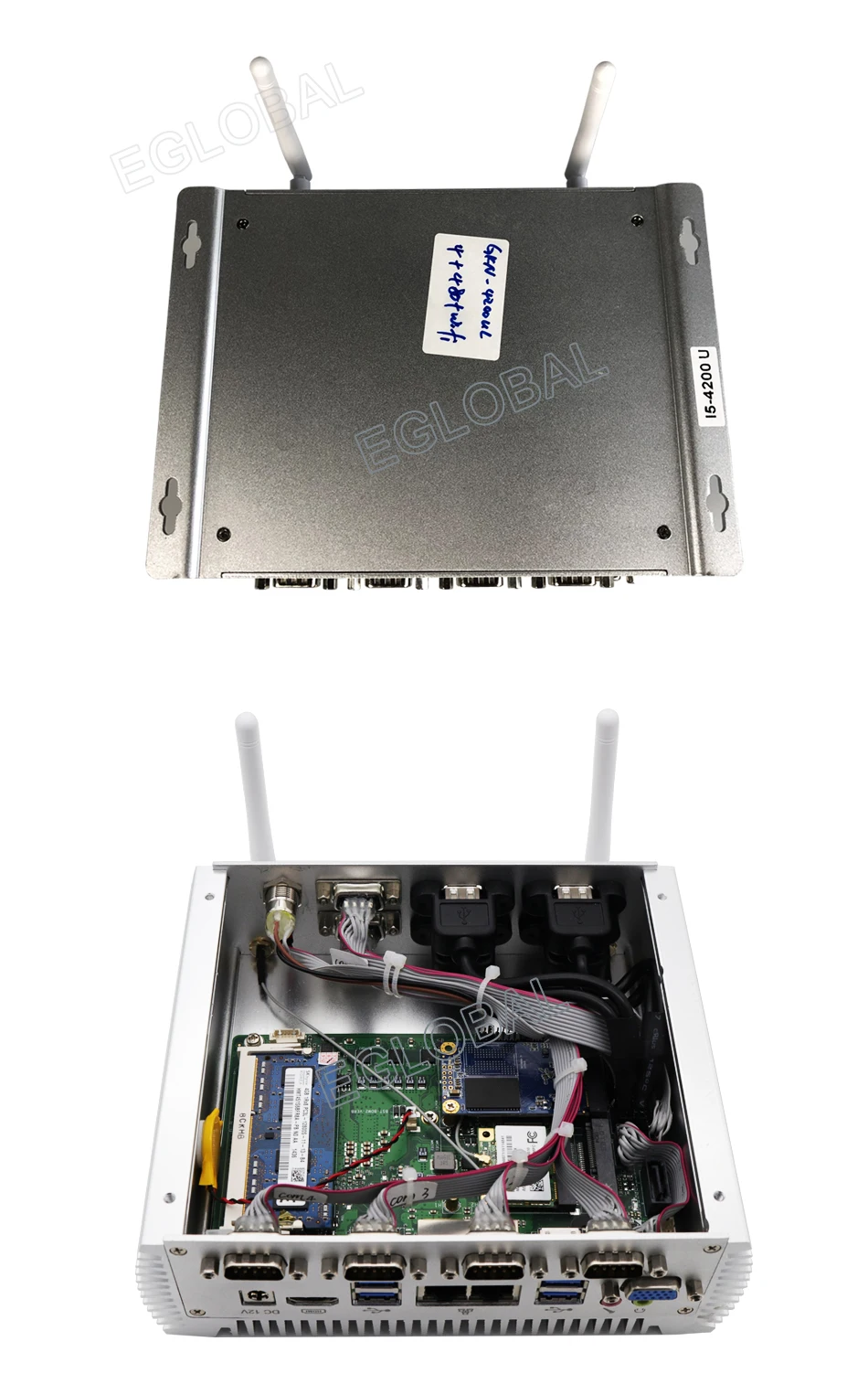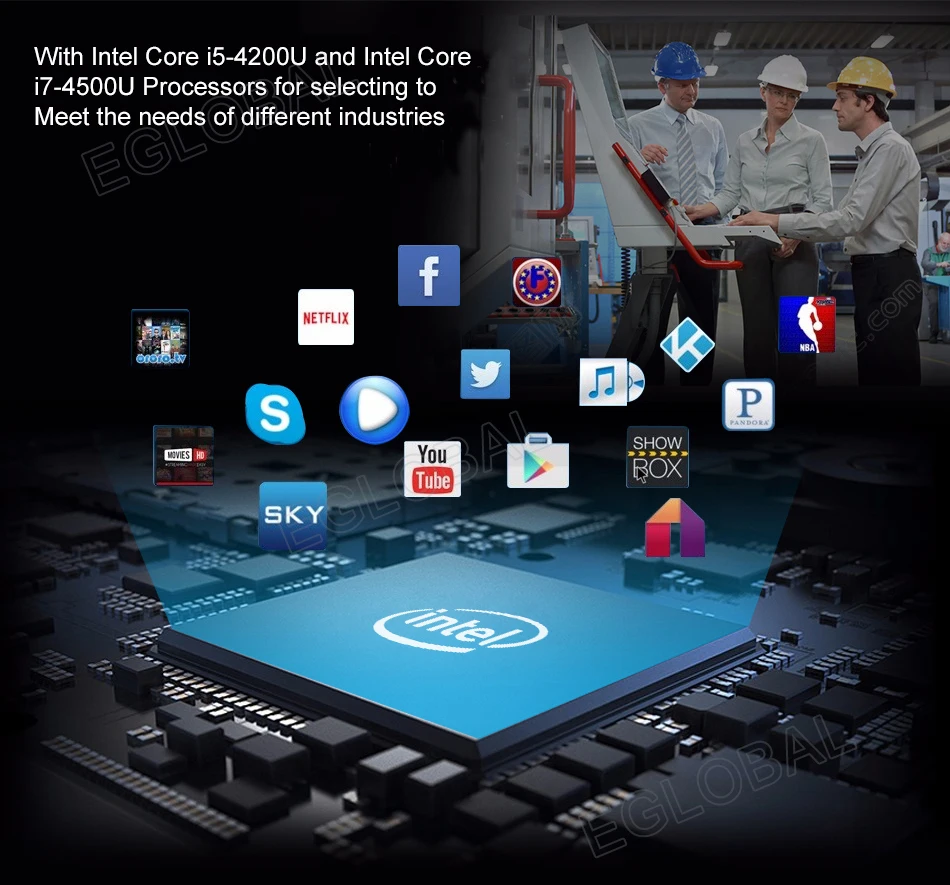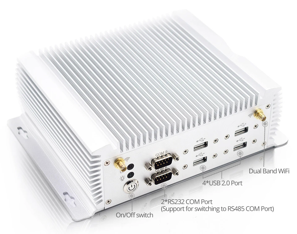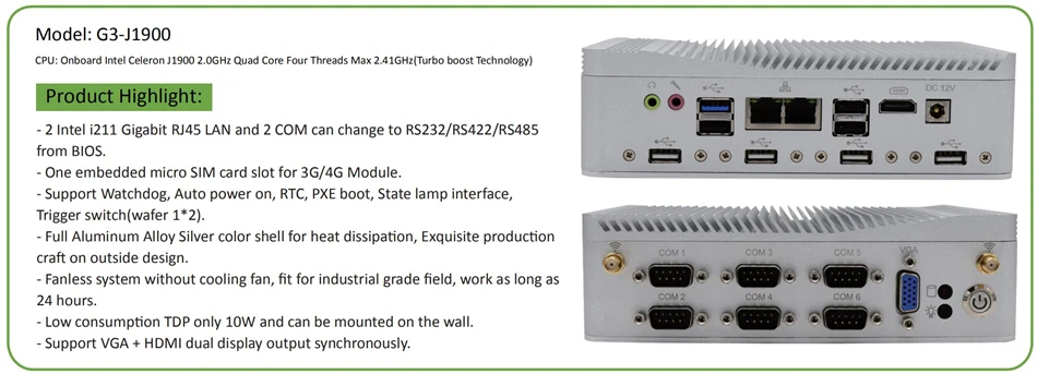 Processor has 3 options: 1. Intel Core i5 4200U (3M Cache, 1.6-2.6GHz) 2 core 4 threads, Intel HD 4400 Graphics,DDR3L RAM 2. Intel Core i7 4500U (4M Cache, 1.8-3.0 GHz) 2 core 4 threads, Intel HD 4400 Graphics,DDR3L RAM 3. Intel Celeron J1900 (2M Cache, 2-2.42 GHz) 4 core 4 threads, Intel HD Graphics,DDR3L RAM Industrial Mini PC Intel Core i7-4500U i5-4200U Celeron J1900 Processors, support Windows 10, Windows 8.1, Windows 7, Linux & Ubuntu, support dual storage 1*mSATA +1*2.5inch SATA SSD/HDD, multi-USB ports, Dual Intel i211 Gigabit Ethernet LAN ports, Mini PCI-E WiFi 802.11b/g/n(Buletooth optional ), RS232 Serial Ports ( 2x RS485/RS422 optional ), HDMI & VGA Dual Display, Aluminum Chassis & Fanless passive Cooling & Zeor Noise & Energy saving, Watch Dog function, Auto power on, RTC Wake up, Support 3G/4G module and SIM card