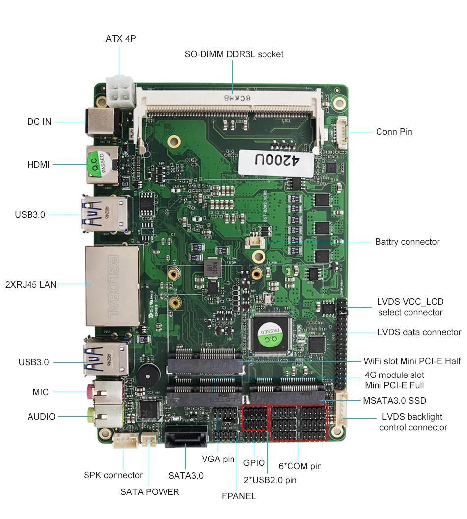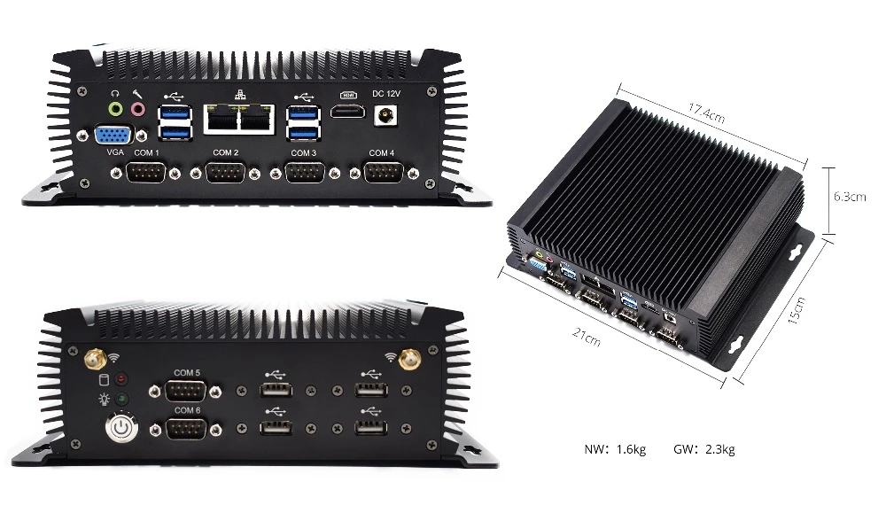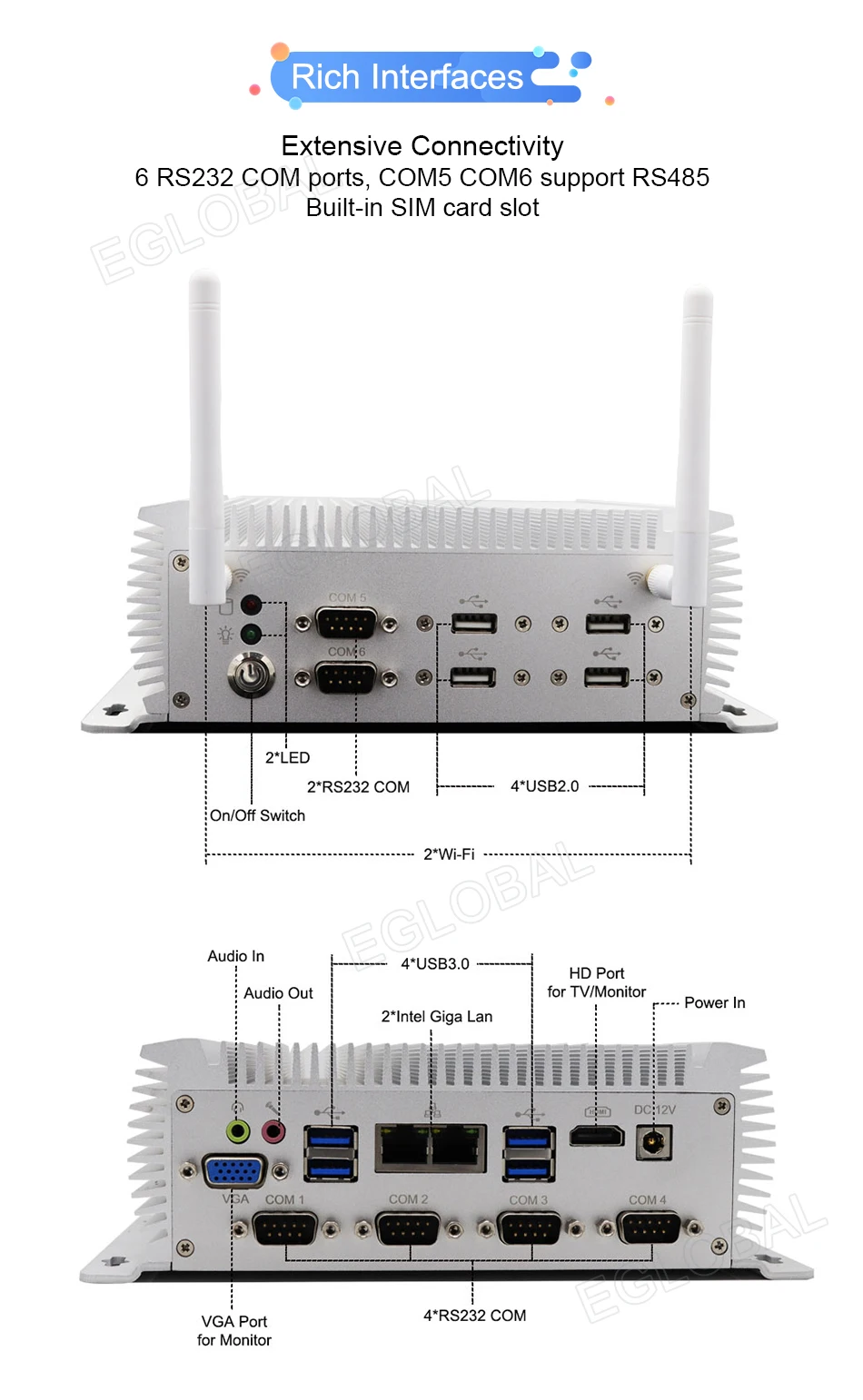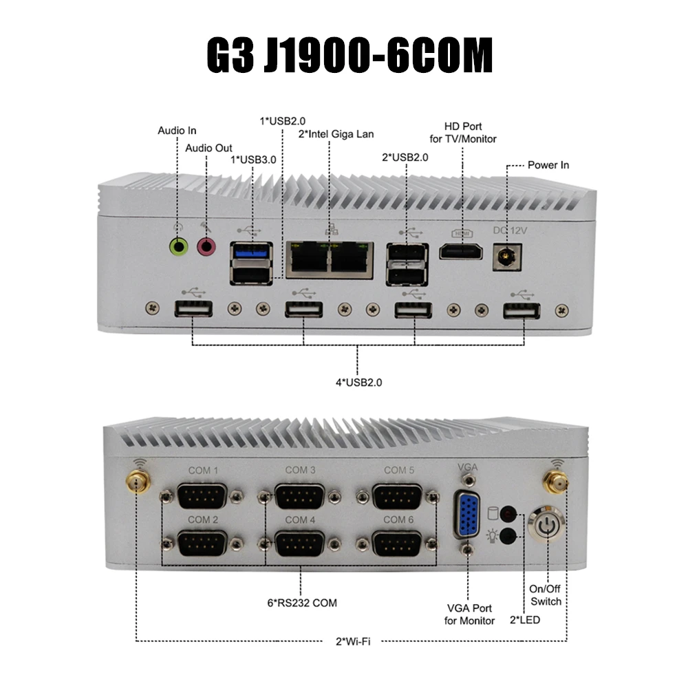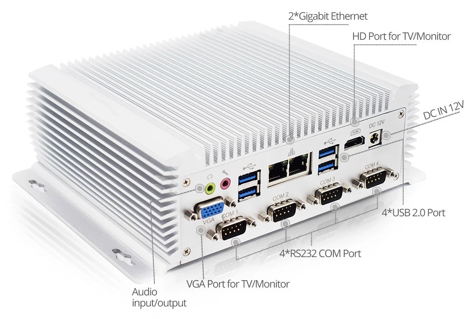 G1 model: 2*LANs, 1*HDMI, 1*VGA, 6*RS232(COM5, COM6 RS232/422/485), 4*USB3.0, 4*USB2.0