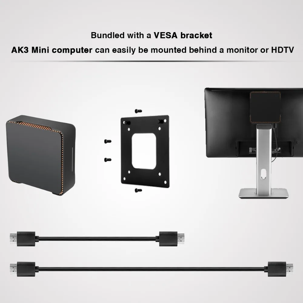 What's in the package 1 * AK3V Mini PC 1 * Charger ( US / EU / UK / AU ) 1 * HDMI Cable 1 * Manual ( English ) 1 * VESA