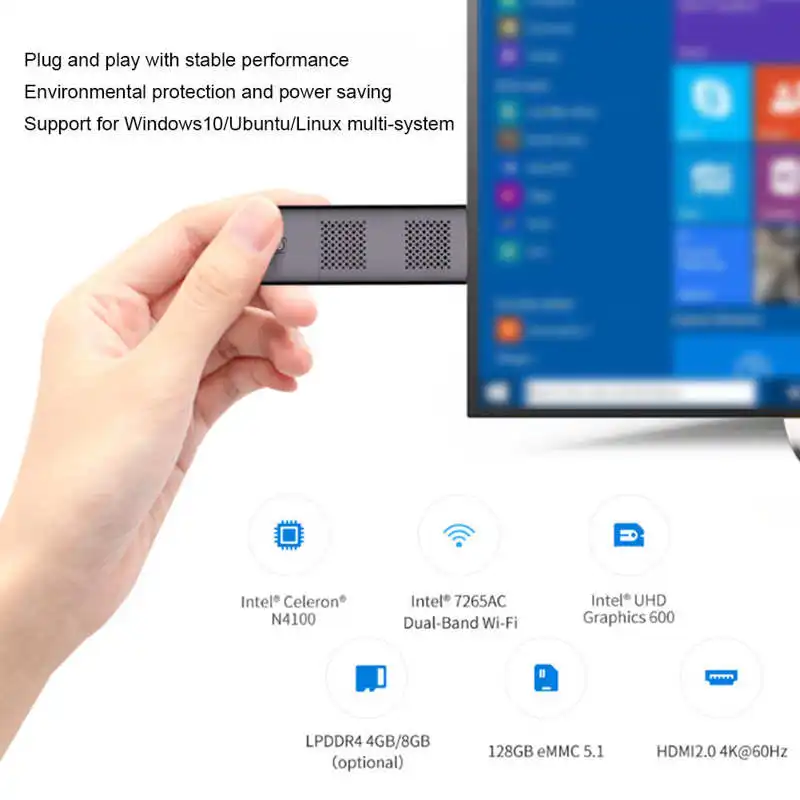 | Computer Stick Mini PC N4100 4gb LPDDR4/128gb eMMC HDMI2.0 4K60HZ Mini Desktop Host 100-240V Mini Desktop Computer Host |