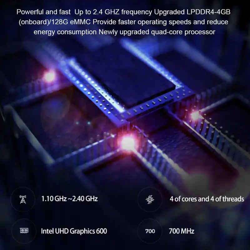 Feature: 1. Powerful and fast Mini PC N4100 runs at a basic frequency of 1.1 GHz up to 2.4 GHZ in burst mode, and has an upgraded LPDDR4‑4GB (onboard)/128G eMMC, which provide faster operating speeds and reduce energy consumption. Newly upgraded quad‑core processor, performance increased by 100%