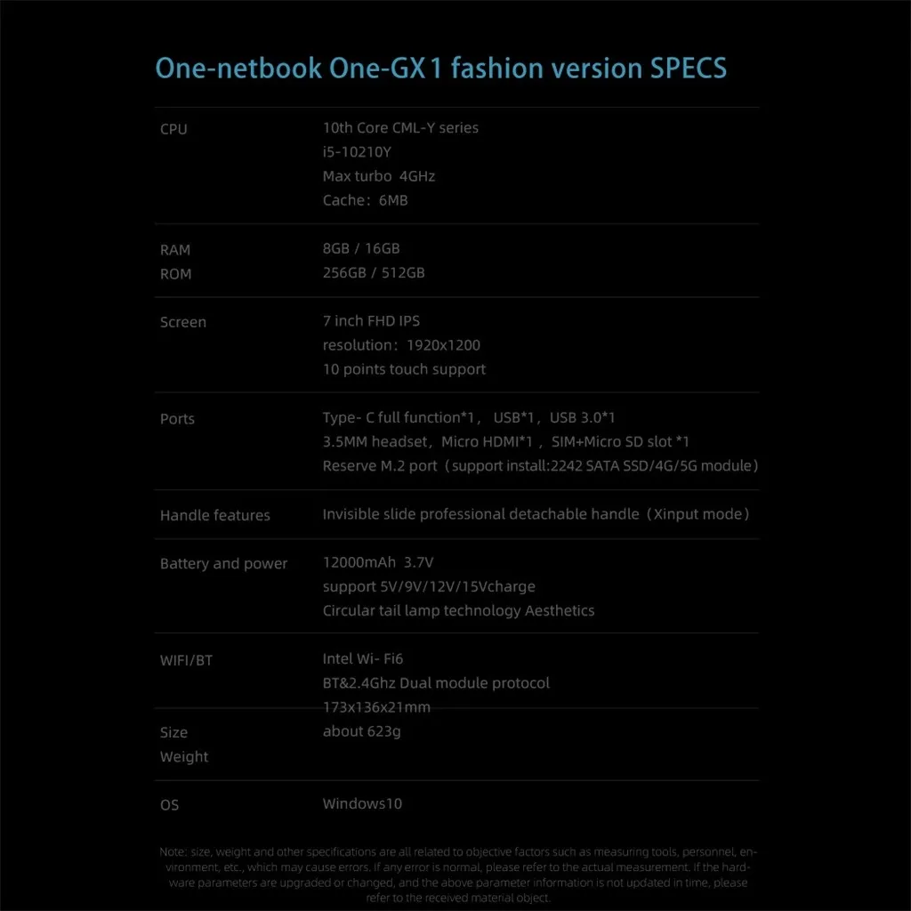 | Gaming notebook tablet ONE-NETBOOK OneGx1 i5-10210Y 8GB RAM 256GB ROM/16G RAM 512G ROM 7 Inch 1920x1200 Windows 10 4G |