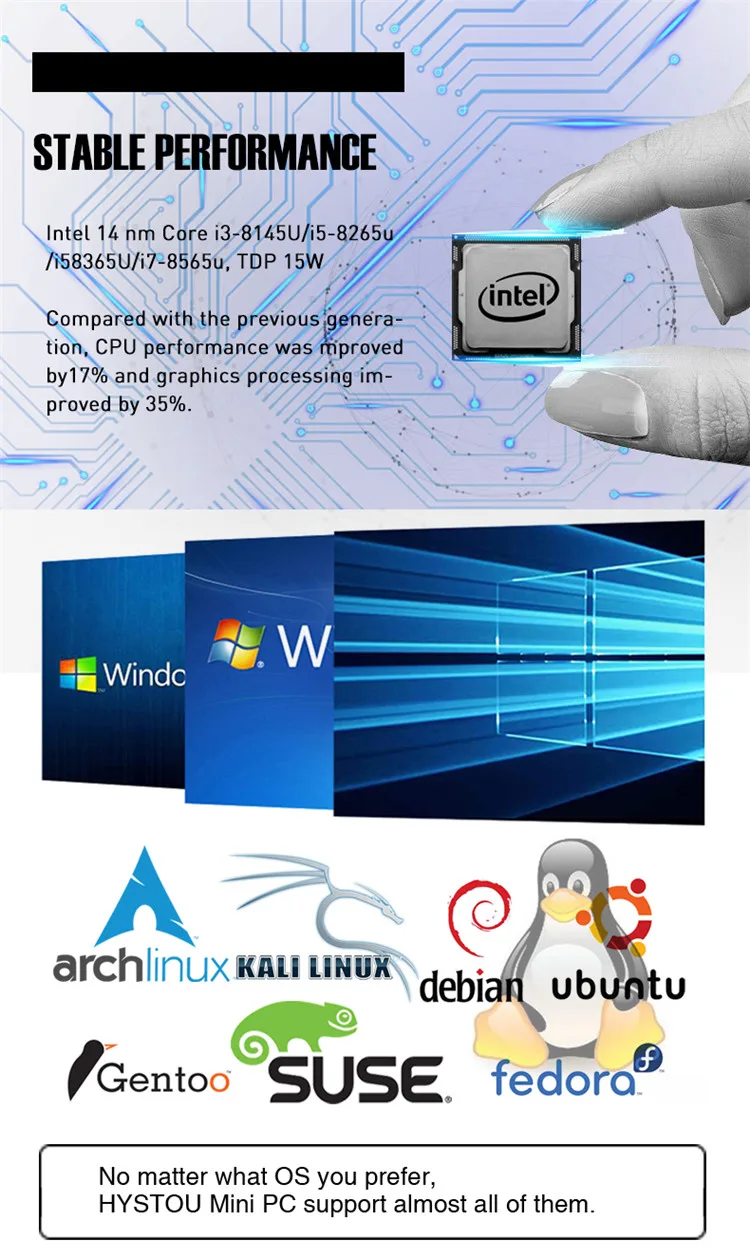 [Faster Running Speed] Equipped with Intel Core i3-8145U/ i5 8265U processor , pre-installed Windows 10 Pro(64-bit) Mini PC. Powerful hardware makes it run more stable. Creates smoothly experience for your visually home entertainment, Streaming video, Web Browsing, Gaming, and Work.[Great Home Theater PC] The mini desktop computer comes with 4K ultra high definition streaming capability, giving you a best-in-class television experience with true-to-life picture quality, which can be used as a media center to enjoy TV shows or games.[Memory expansion] Equipped with 260 pin DDR4. Support up to 64GB. The memory can be expanded up to 128 GB with a micro SD card and up to 2 TB with a standard 2.5-inch SATA HDD / SSD . You can also plug in a 2TB mobile hard drive box via the USB 3.0 interface.[Dual Screen Display]Built with HDMI and DP port, seamlessly connecting two monitors. With integrated Intel HD graphic to enjoy 4K Web surfing, video playback, watching TV, home theater, enjoy the entertainment with your family. Support 2.4G/5.8G Band WiFi.[Windows 10 Pro] Pre-installed with Windows 10 Pro(64bit) OS.Support Auto-on after power failure(1.Press On/Off Switch on the pc and then keep press “Delete”until goes into bios 2.Find “State After G3” under “PCH_IO configuration” page, change “s5 state” to “s0 state”, press “Enter” key. 3.Press “F10” key to save the setting and finish the setting. From now on any illegal shutdown will bring auto power on after the pc connect to main supply.)[Unique design&Function] Support 64 bits computing Turbo boost Hyper-Threading Virtualization technology etc, Can install 1 pc 2.5'' HDD+1pc mSATA SSD +1pc M.2 SSD, highest speed up to 6Gbps. Come with a wall-mounted holder to allow you to hang mini computer behind monitor. Saving your desk space and letting you desk look more tidy, Mini PC Support Wake On LAN, PXE Boot, RTC Wake, Auto Power On( get into BIOS interface settings)[No noise & portability] The fanless design of this mini PC can save power and achieve zero noise. The unique shell design and energy-saving components make cooling faster and more efficient. We presented a mini console stand in the package, which can save a lot of space. [Reliable Lifetime Service] Our group has been dedicating to the production and R&D design of Mini PC for many years. And all our products have passed strict inspesction before outgoing. If you have any questions, Please don't hesitate to contact Us. And we are 100% guaranteed to solve your problems. We offer 3 year limited parts and on-site service, toll-free lifetime technical support online. All of our products obtained FCC, CE, ROSH Certifications.Product Pacakge:
