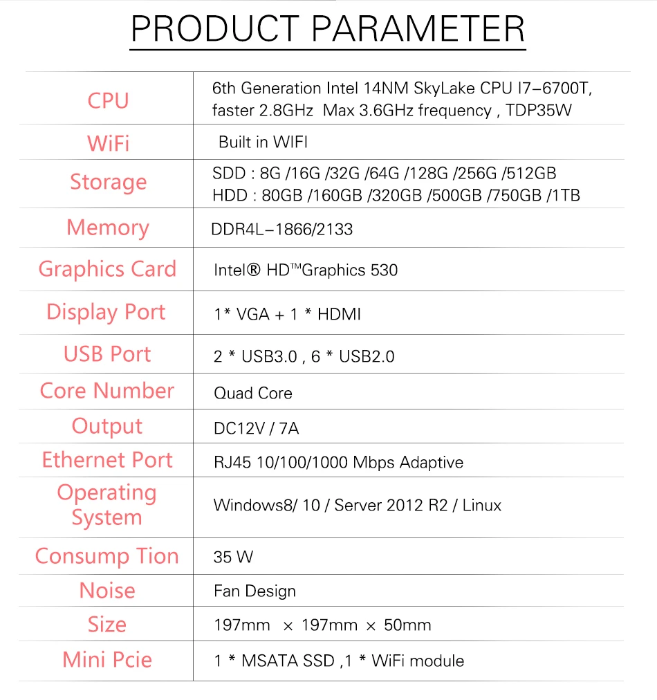 1. Kaby Lake 14nm CPU Intel Core i7 7700T 4 cores 8 threads 2.9GHz Max 3.8GHz 8MB cache TDP 35W Intel® HD Graphics 630.