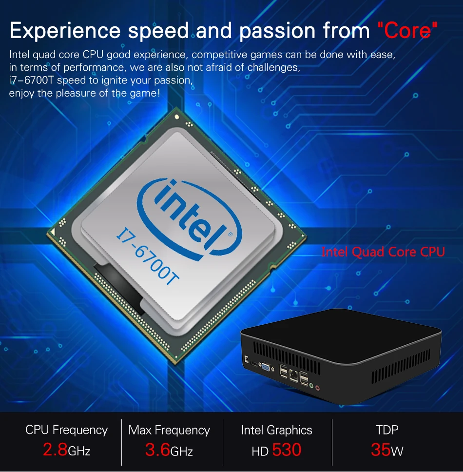 2. Skylake 14nm CPU Intel Core i7 6700T 4 cores 8 threads 2.8GHz Max 3.6GHz 8MB cache TDP 35W Intel® HD Graphics 530. 1. Skylake 14nm CPU Intel Core i5 6500T 4 cores 4 threads 2.5GHz Max 3.1GHz 6MB cache TDP 35W Intel® HD Graphics 530.