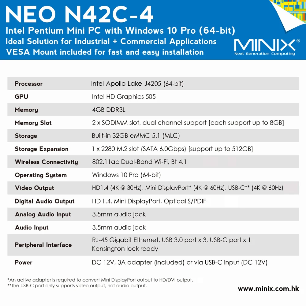 | MINIX Mini PC NEO N42C-4 Mini PC Win10 Pro Intel Apollo Lake J4205 UHD 4K Media Player 4GB/64GB 2.4GHz+5GHz WiFi USB3.0 BT4.1 #X |