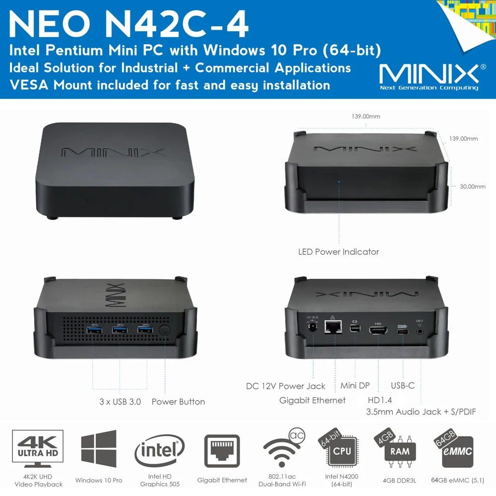 MINIX Mini PC NEO N42C-4 Mini PC Win10 Pro Intel Apollo Lake J4205 UHD 4K Media Player 4GB/64GB 2.4GHz+5GHz WiFi USB3.0 BT4.1 #X