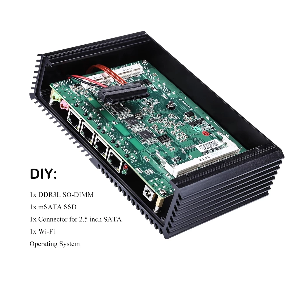 This link excludes Wi-Fi. If you need it, please click below link: • 1 x Power Button • 1 x Power LED • 1 x Serial Port (RS-232) • 1 x HD Video Port • 2 x USB 2.0 & 2 x USB 3.0 • 1 x DV 12V DC input • HDD LED, Power LEDs • 4 x Intel I211-AT- 10/100/1000 Controller • 1 x Speak Out Connector • 1 x Mic In Connector • 1 x Full Mini pcie slot (for mSATA SSD) • 1 x SATA connector • 1 x Half Mini pcie slot (for WIFI/Bluetooth Module) • 1 x DDR3L SO-DIMM Memory Slot • 1 x Automatically boot jumper 3.5 inch Mini Motherboard Fan-less design. No noise. If you only wanna buy a motherboard, it will come with CPU fan by default. Click below picture to get more information: 1 x Mini PC 1 x Power supply: adapter and plug (US/ UK/ EU/ AU/ IT standard) 1 x VESA bracket & screws 1 x color box by default, if you need neutral packing box, please leave a message. You can leave message to require for Motherboard User Manual and Windows drivers download link. Q300G4-1U have same motherboard and ports as Q300G4 Mini case, please click below picture to pay price difference USD 16 and extra shipping cost USD 12. * Q300G4-1U has CPU fan New arrival Q710G4 with Intel Celeron j3455 processor onboard, quad core 1.5 GHz, up to 2.3 GHz. 4x Intel I211-AT Gigabit LAN, Support POE