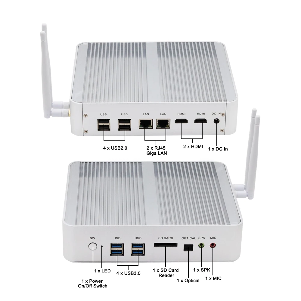 | Super Fanless Mini PC Windows 10 Pro Intel Core i5-5200U i7-5500U SD Card 4K HTPC 16G Ram 512G SSD 1TB HDD 2*HDMI 2*Nics WiFi BT |